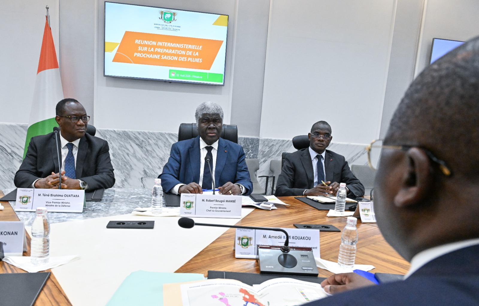 Abidjan, le 02 avril 2026 - Le Premier Ministre, Chef du Gouvernement, Robert Beugré Mambé, avec à ses côtés le Vice-Premier Ministre, Ministre de la Défense, Téné Birahima Ouattara, a présidé une réunion inter-ministérielle sur la prochaine saison des pluies, en vue de prémunir les populations contre les effets néfastes des eaux de pluies. Plusieurs membres du Gouvernement ont pris part à la rencontre, au terme de laquelle trois d’entre eux se sont exprimé.