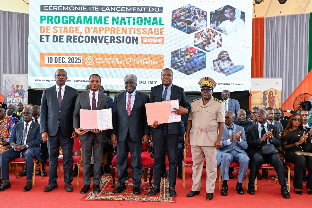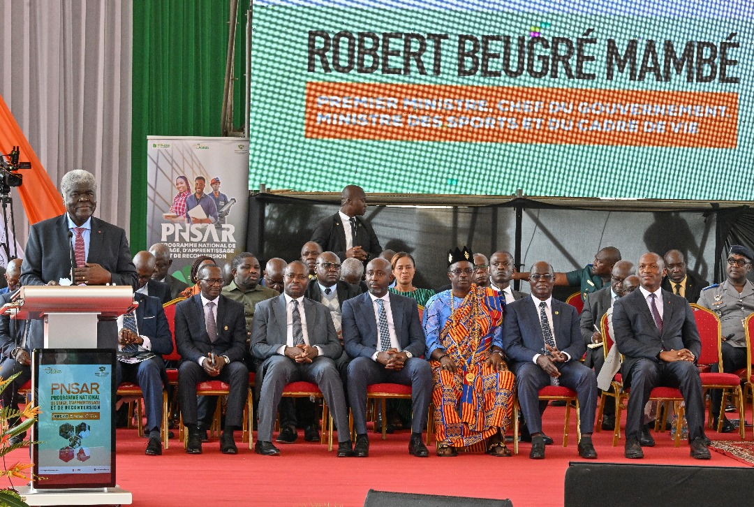 Abidjan, le 10 décembre 2025 – Présidant la cérémonie de lancement du Programme National de Stage, d’Apprentissage et de Reconversion (PNSAR) 2026, le Premier Ministre, Ministre des Sports et du Cadre de Vie, Robert Beugré Mambé, a indiqué le 10 décembre 2025 à Abidjan, que ce programme a pour ambition d’offrir des opportunités à plus de 152 000 jeunes l’année prochaine.